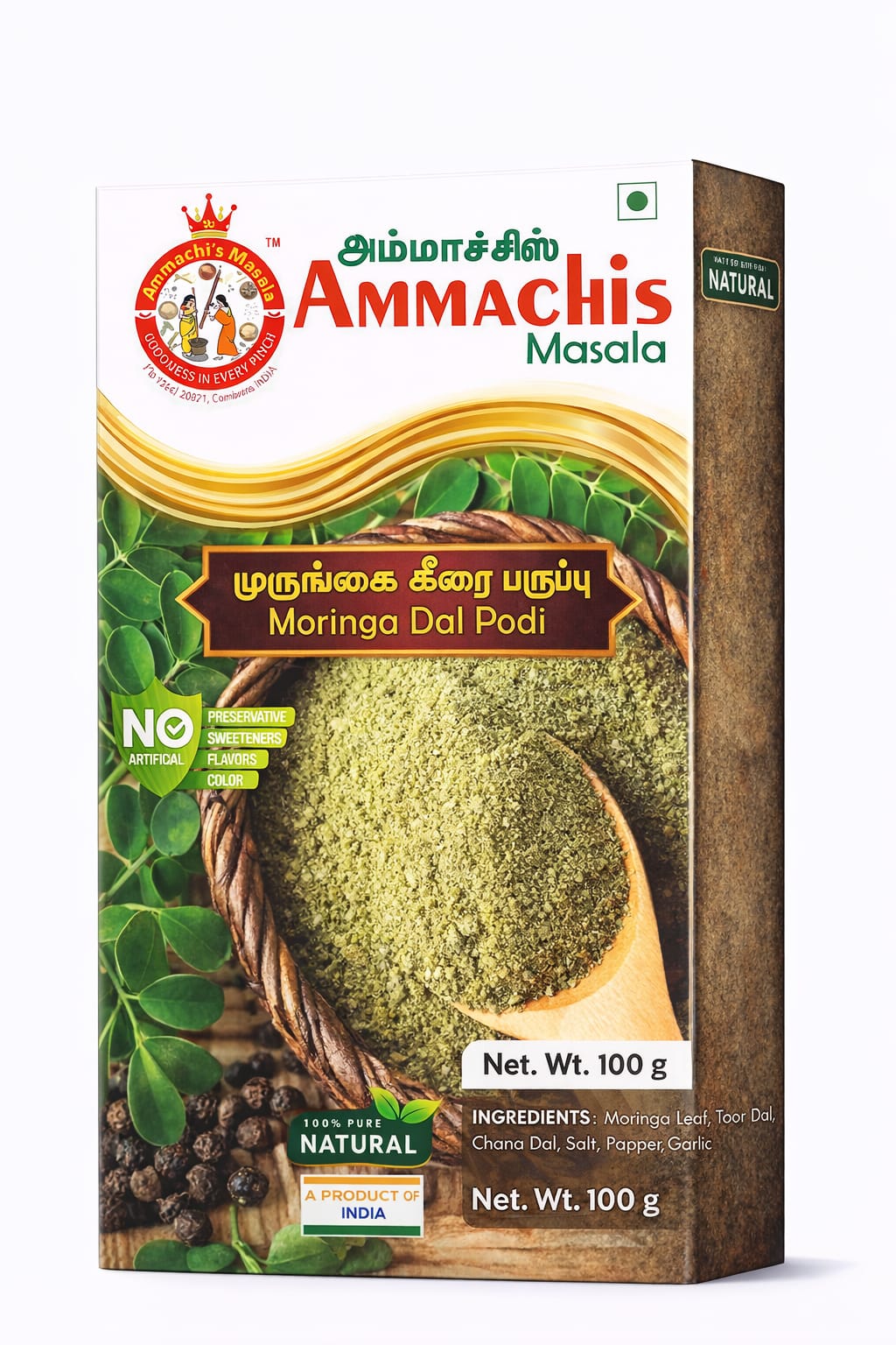 مسحوق مورينجا دال من أماتشي هو مسحوق طبيعي الصنع يجمع بين أوراق المورينجا الغنية بالعناصر الغذائية والعدس المحمص والتوابل التقليدية. يقدم هذا المُتبّل الصحي نكهة أصيلة وفوائد غذائية، مما يجعله إضافة ممتازة لوجباتك اليومية. ببساطة، امزجه مع السمن ورشّه على الإيدلي أو الدوسا أو الأرز لتعزيز النكهة والقيمة الغذائية على الفور. مصنوع بدون مواد حافظة أو مكونات صناعية، يُحافظ هذا المسحوق على طرق التحضير التقليدية مع تقديم فوائد الأطعمة الطبيعية الغنية إلى مائدة عائلتك.