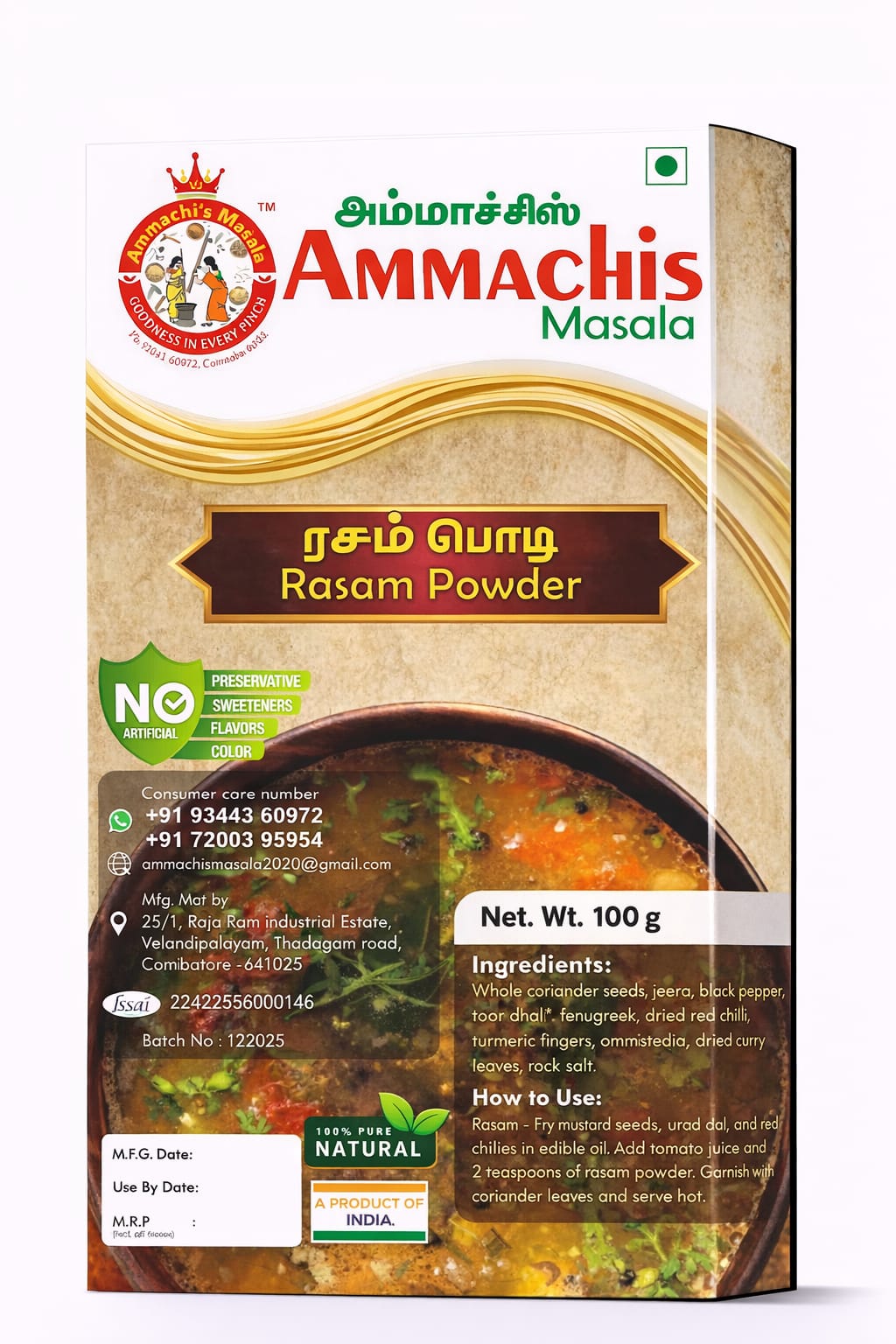 مسحوق راسام هو مزيج توابل تقليدي من جنوب الهند، مصنوع من الفلفل الأحمر المجفف بالشمس، والفلفل الأسود، والكمون، وبذور الحلبة، مطحونة بدقة متناهية. يمنح هذا المسحوق العطري نكهة الحرارة اللاذعة الأصيلة التي لا غنى عنها في حساء راسام الكلاسيكي. مصنوع من مكونات طبيعية بالكامل، وخالٍ من أي إضافات صناعية، كل ملعقة منه تُضفي دفء الطبخ التقليدي على مطبخك. ببساطة، امزجه مع التمر الهندي والمرق لتحصل على راسام لذيذ وسريع التحضير، يجسد خبرة أجيال من الطهاة.
